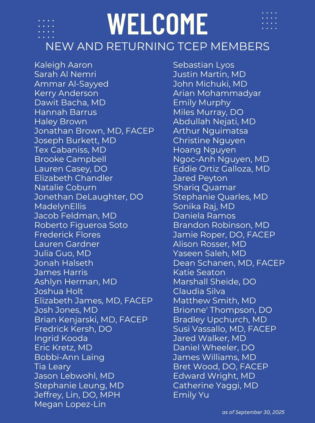 Got research worth sharing? EM students, residents, and fellows—get ready! The Call for Abstracts for TCEP’s 2026 Annual Research Forum opens November 4. Showcase your work, earn recognition, and join us at CONNECT 2026 in Rockwall, TX, where winners will be honored at the Annual Business Meeting and Awards Luncheon. READ MORE.