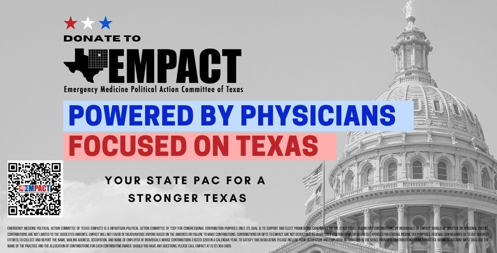 I wanted to write this month about the importance of EMPACT to all of our members and all of our patients. While our website does a great job of detailing the priority: giving Emergency Physicians a united voice in the political process. This bi-partisan engagement to improve emergency care across the state is essential to maintaining our ability to both care for our patients and protect them. There is a great deal of responsible, thoughtful and thorough discourse regarding how to disperse the precious funds donated. If we don’t proactively support the legislative process, our practices and our patients will suffer.